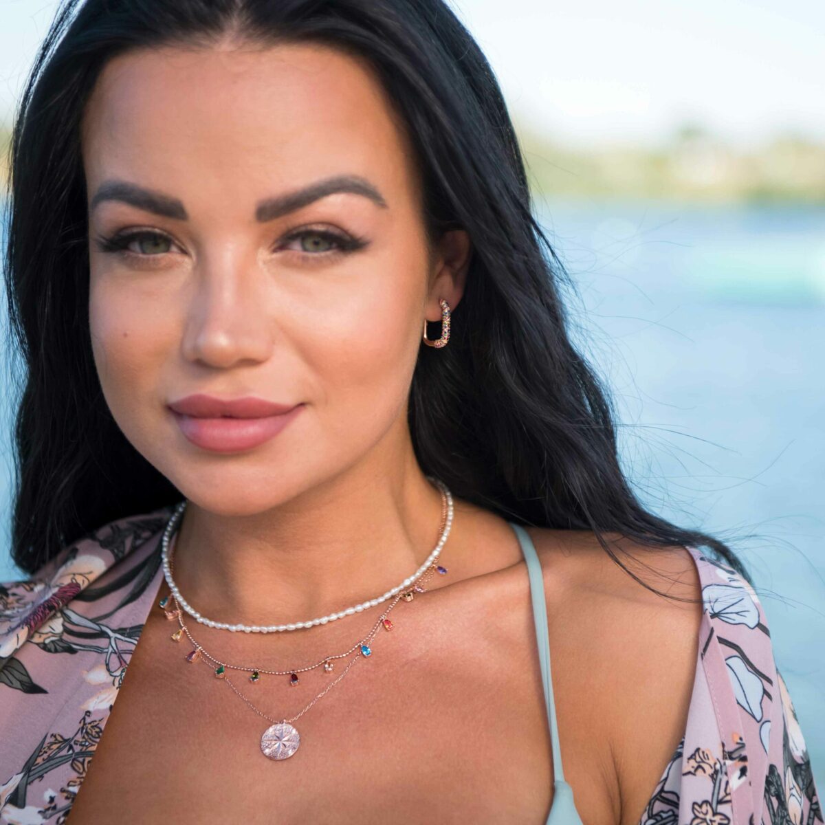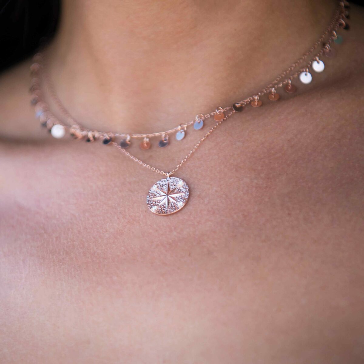 Náhrdelník s príveskom "veterná ružica" zo 4 zirkónmi, zo striebra 925 pozláteným ružovým zlatom.