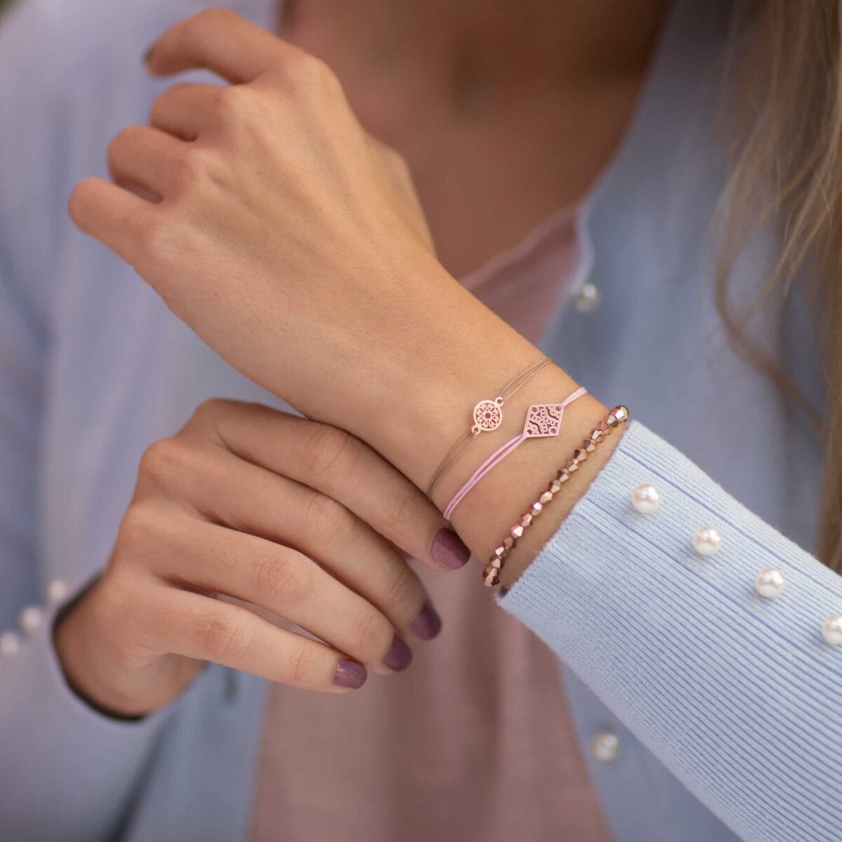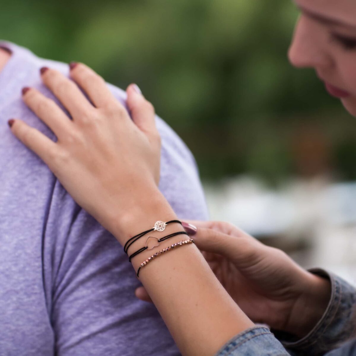 Dávajte si pozor pri navliekaní šnúrkových náramkov, aby ste pri ťahaní za šnúrky nevyvíjali príliš veľkú silu na povrch alebo okraje príveskov, pretože sa môžu zdeformovať.