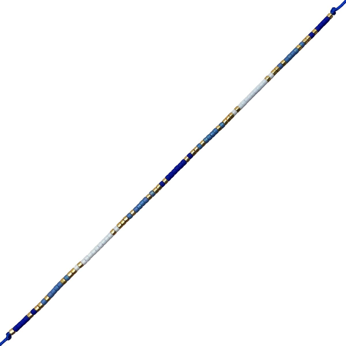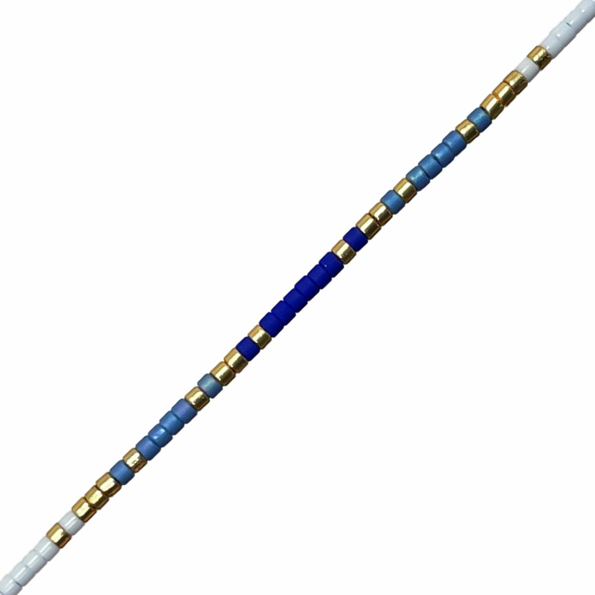 Náramok z japonských valcovitých sklenených korálok Miyuki navlečených na polyamidovej šnúrke vo farbách matná kráľovská modrá, lesklá svetlomodrá, zlatá, matná modrá.