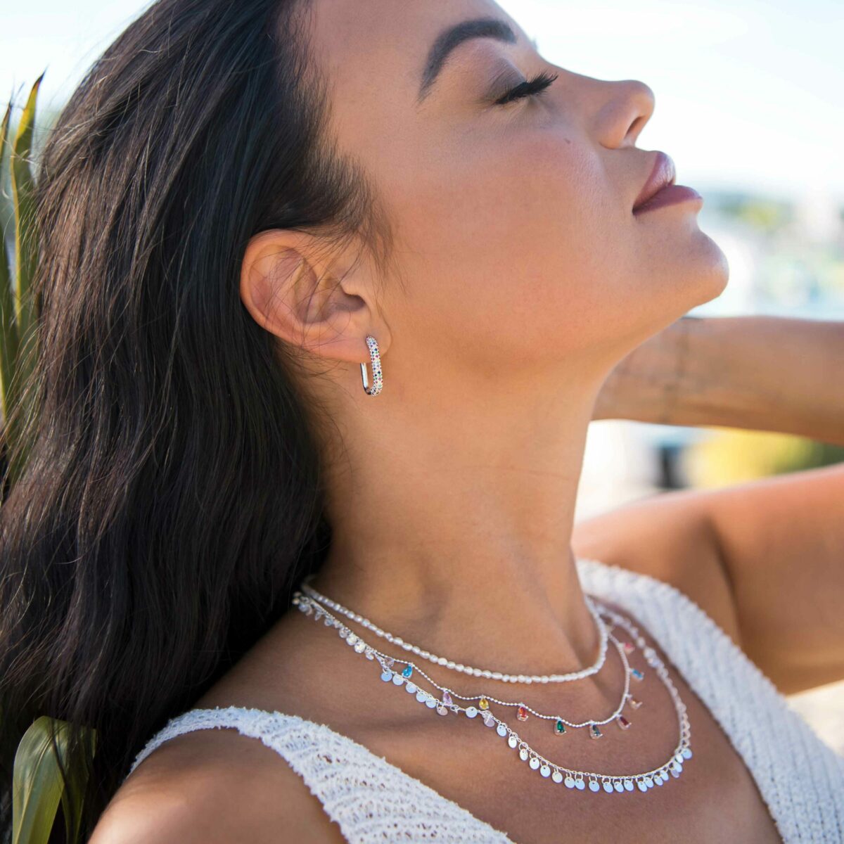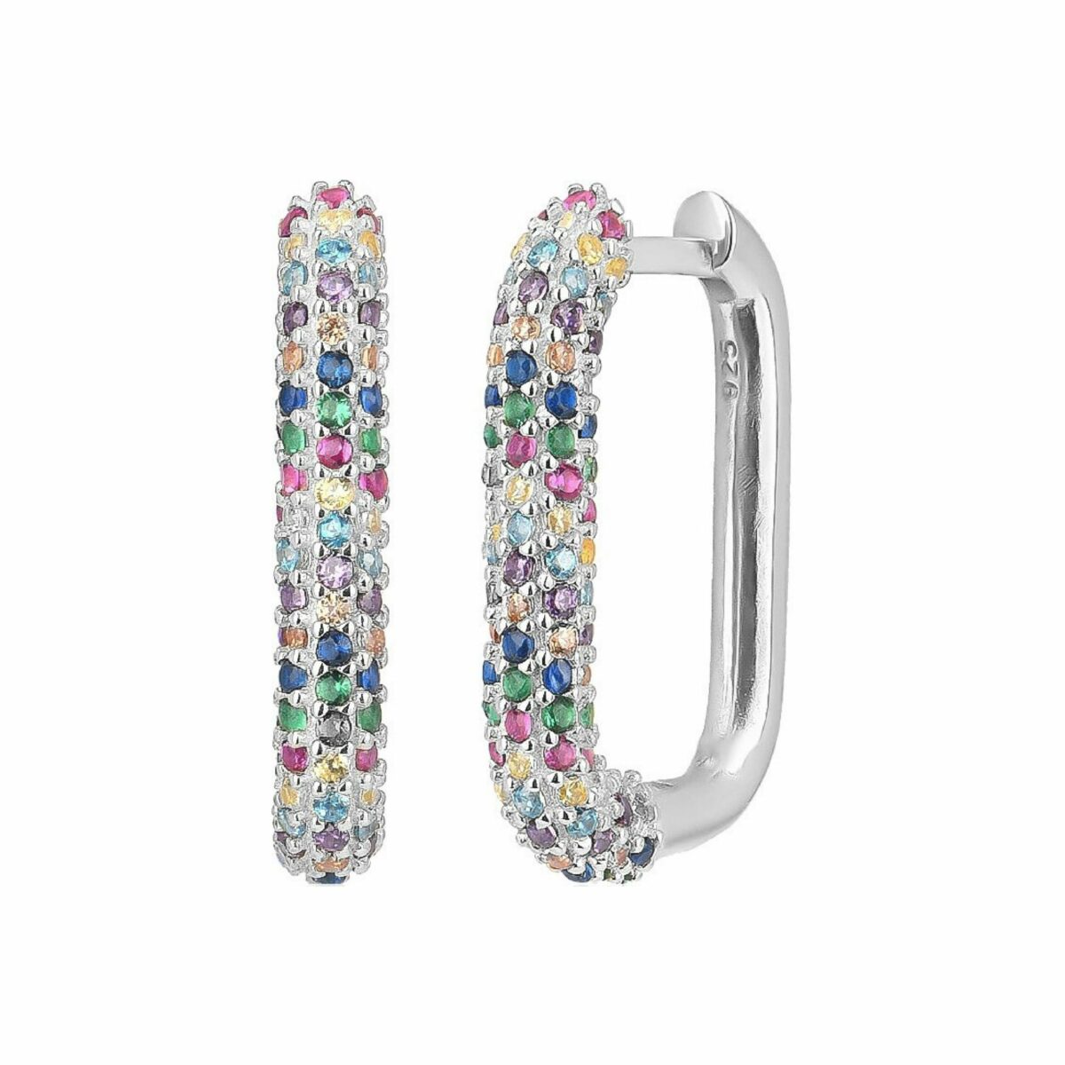 Okrúhle náušnice zo striebra 925, spredu obložené farebnými zirkónmi.
