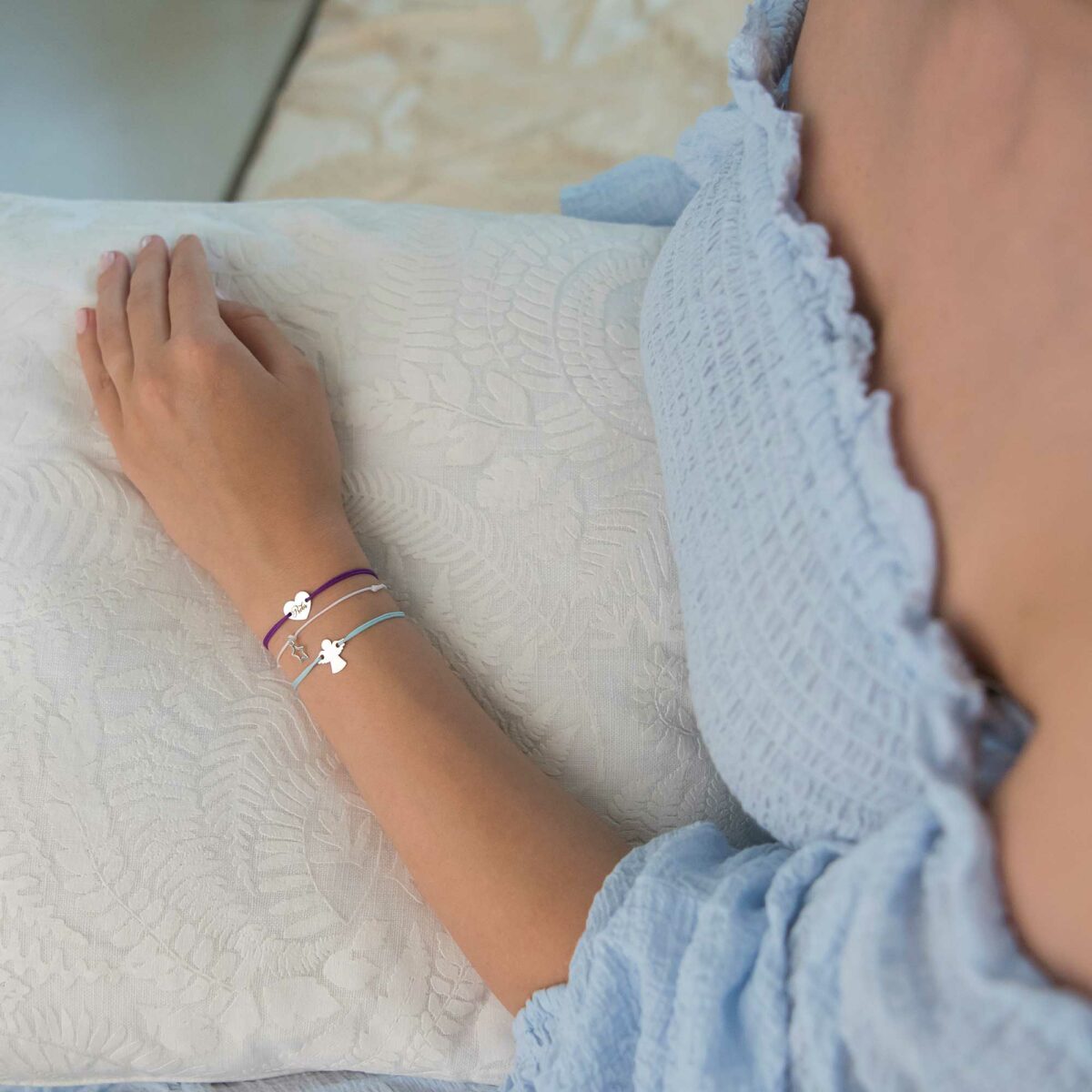 Dávajte si pozor pri navliekaní šnúrkových náramkov, aby ste pri ťahaní za šnúrky nevyvíjali príliš veľkú silu na povrch alebo okraje príveskov, pretože sa môžu zdeformovať.