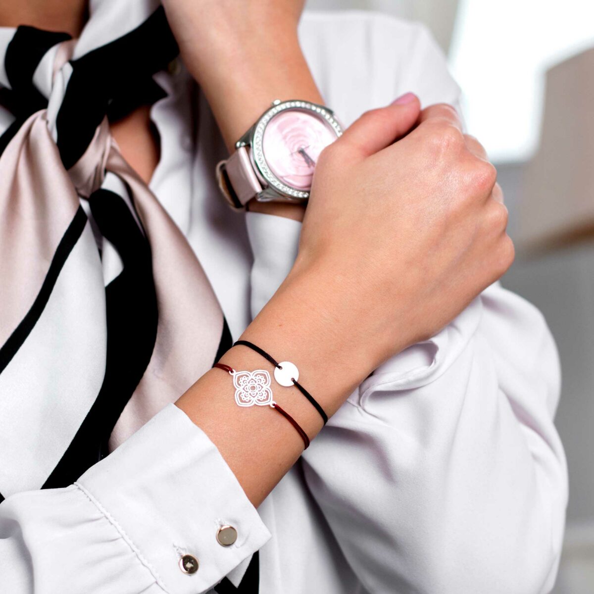 Dávajte si pozor pri navliekaní šnúrkových náramkov, aby ste pri ťahaní za šnúrky nevyvíjali príliš veľkú silu na povrch alebo okraje príveskov, pretože sa môžu zdeformovať.